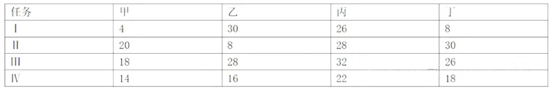 63、某企业承接了一项工程,该工作分为工、I、I、IV四项任务,甲、乙、丙、丁四个项目组完成各项任务的时间如表所示,为实现最优配置,第IV项任务应由() 来完成。